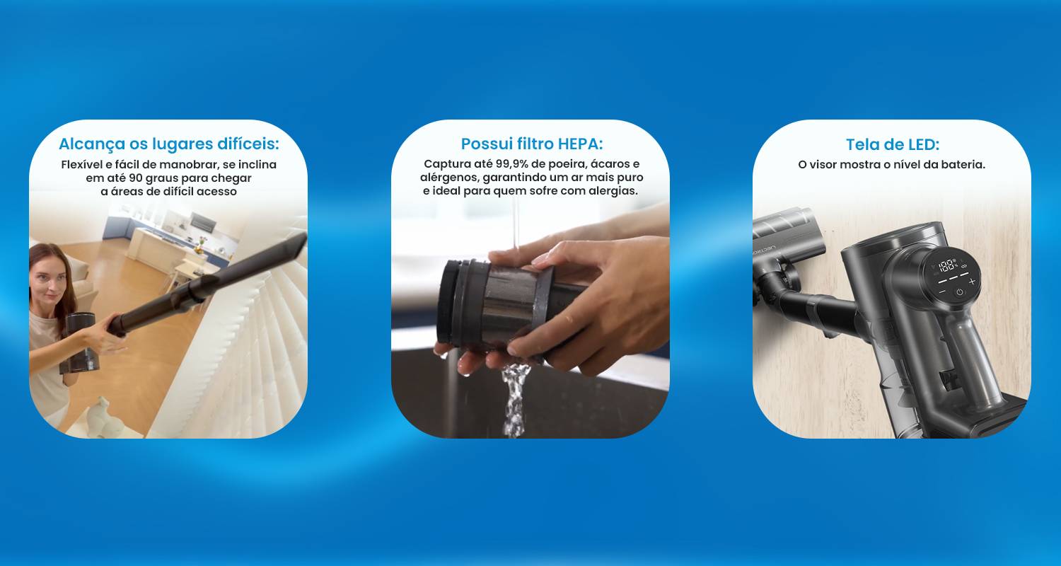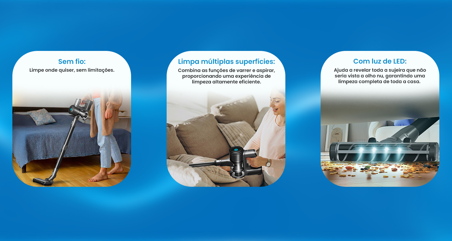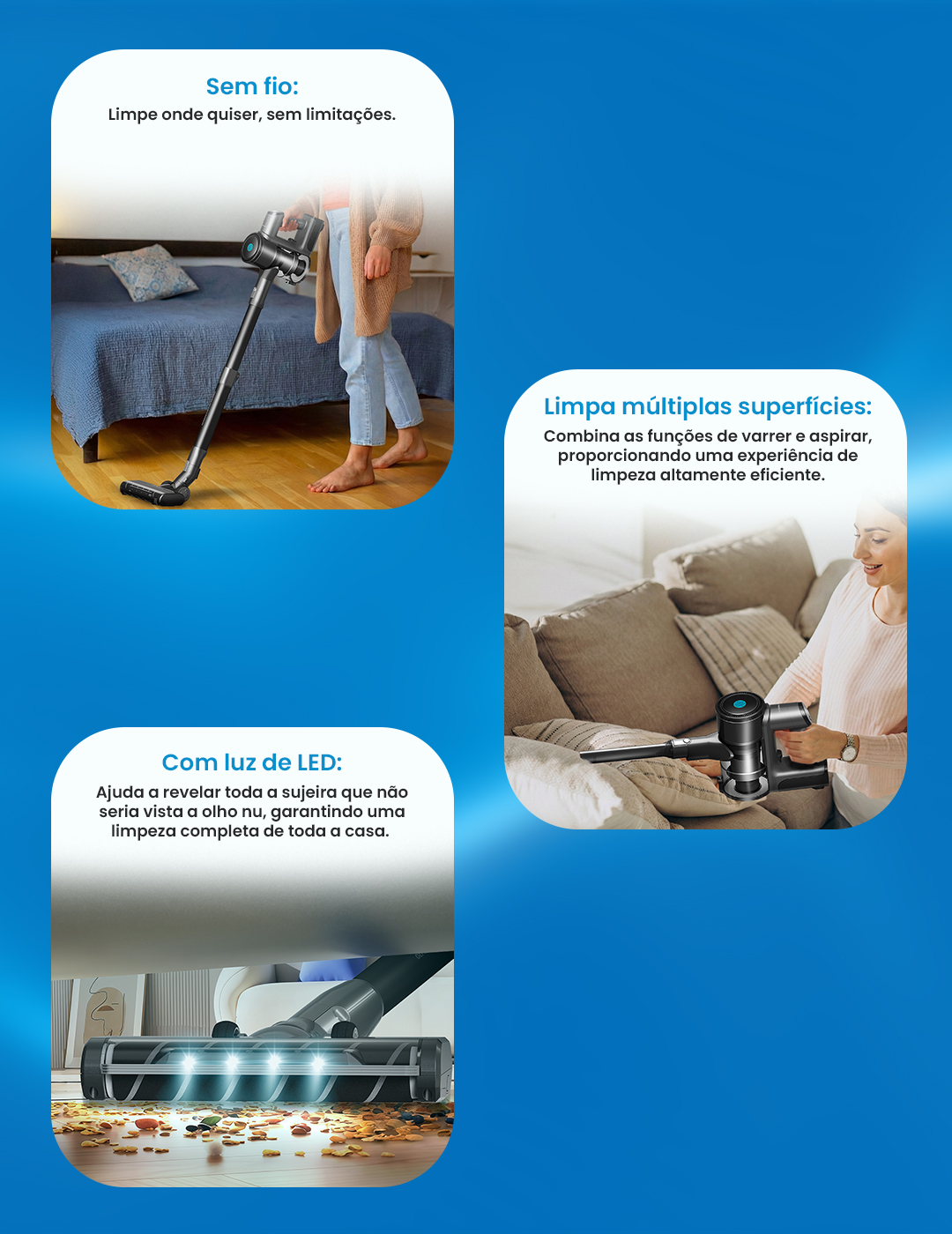 SEM FIO: Limpe onde quiser, sem limitações. Alcance todos os cantos com total liberdade.