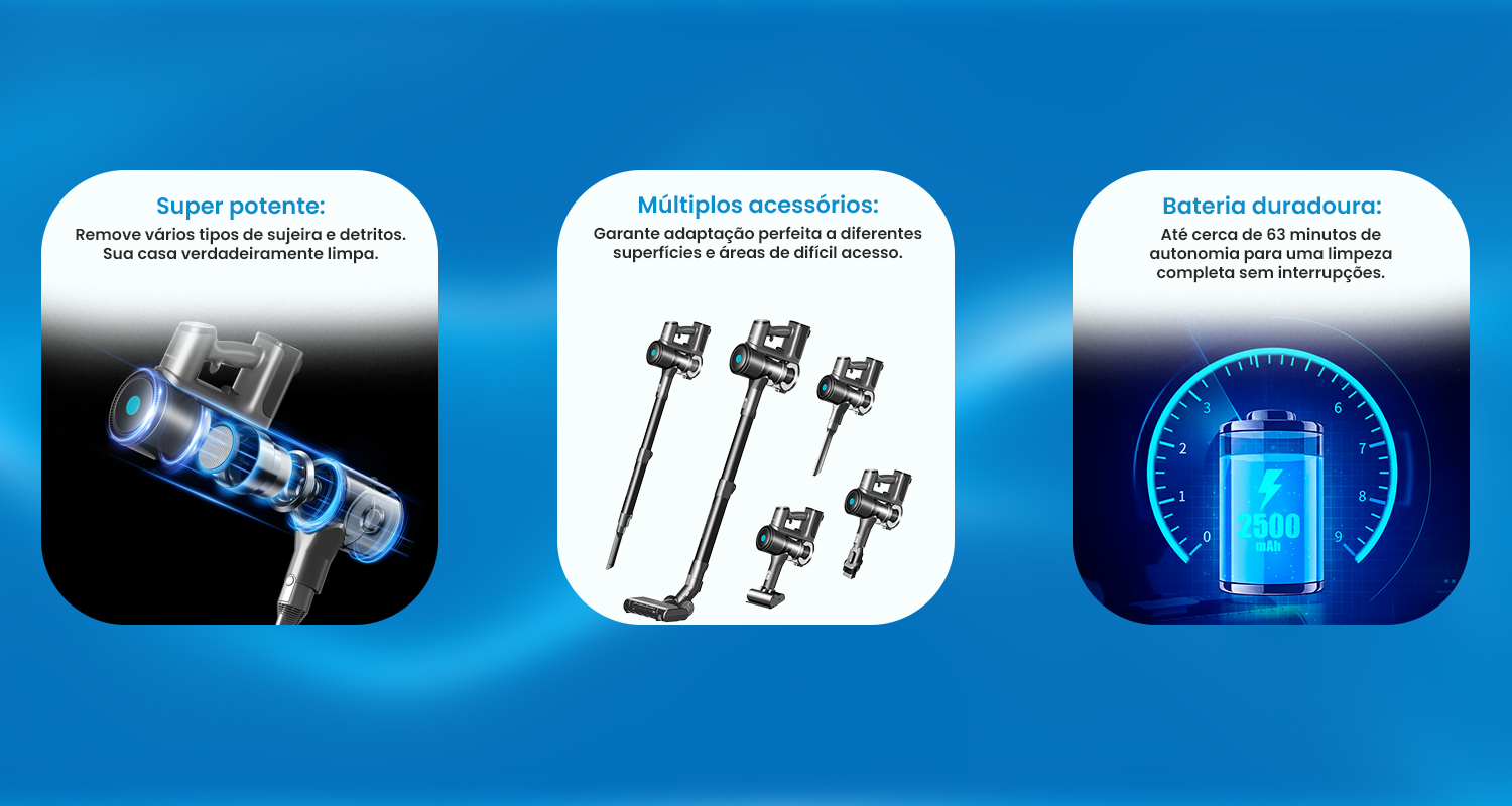 SUPER POTENTE: Com sua alta potência de sucção de 45kPA, é capaz de remover com eficiência vários tipos de sujeira e detritos. Conta ainda com três modos de sucção para ajustar a potência conforme a necessidade, garantindo eficiência em qualquer ambiente.