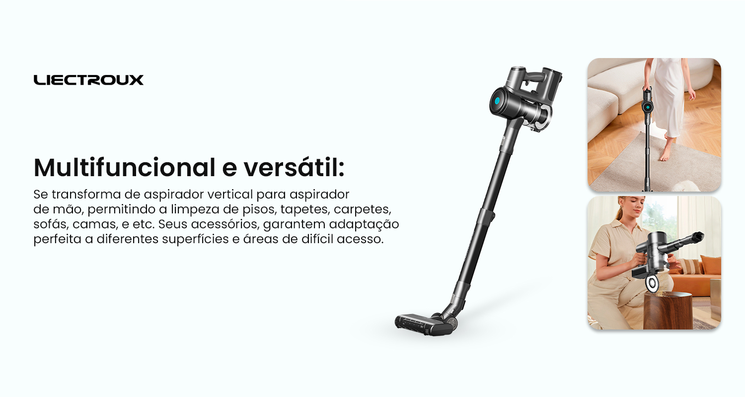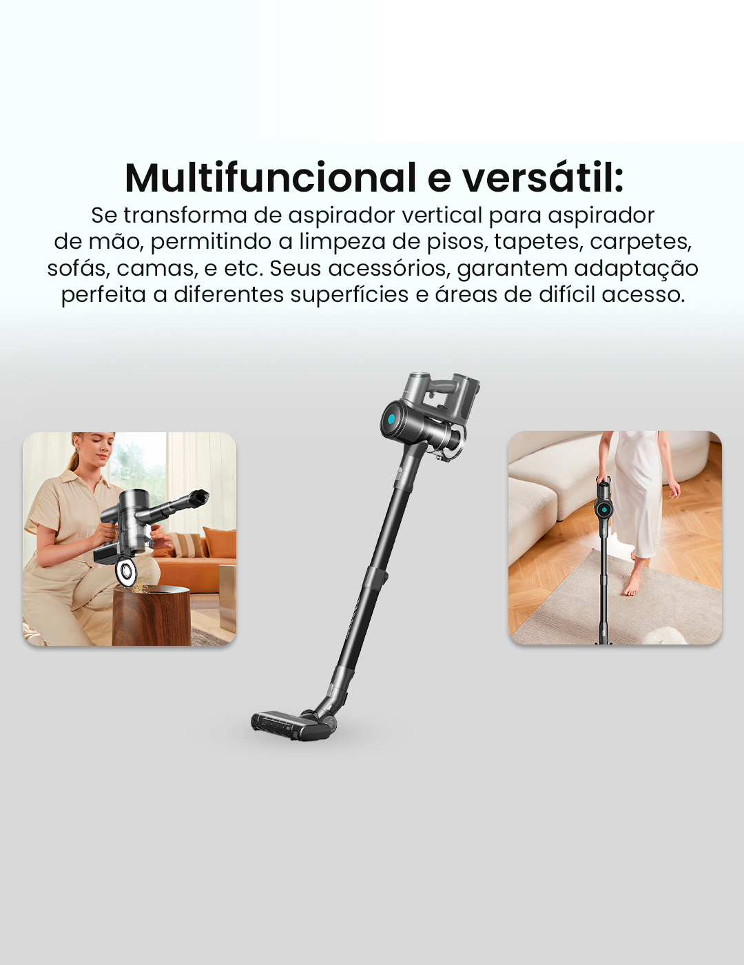 MULTIFUNCIONAL E VERSÁTIL: Transforma-se facilmente de aspirador vertical para aspirador de mão, permitindo a limpeza de pisos, tapetes, carpetes, sofás, camas, persianas, teclados, cantos estreitos e frestas. Seus acessórios, como tubos extensíveis, bocal para frestas e escova 2 em 1, garantem adaptação perfeita a diferentes superfícies e áreas de difícil acesso.