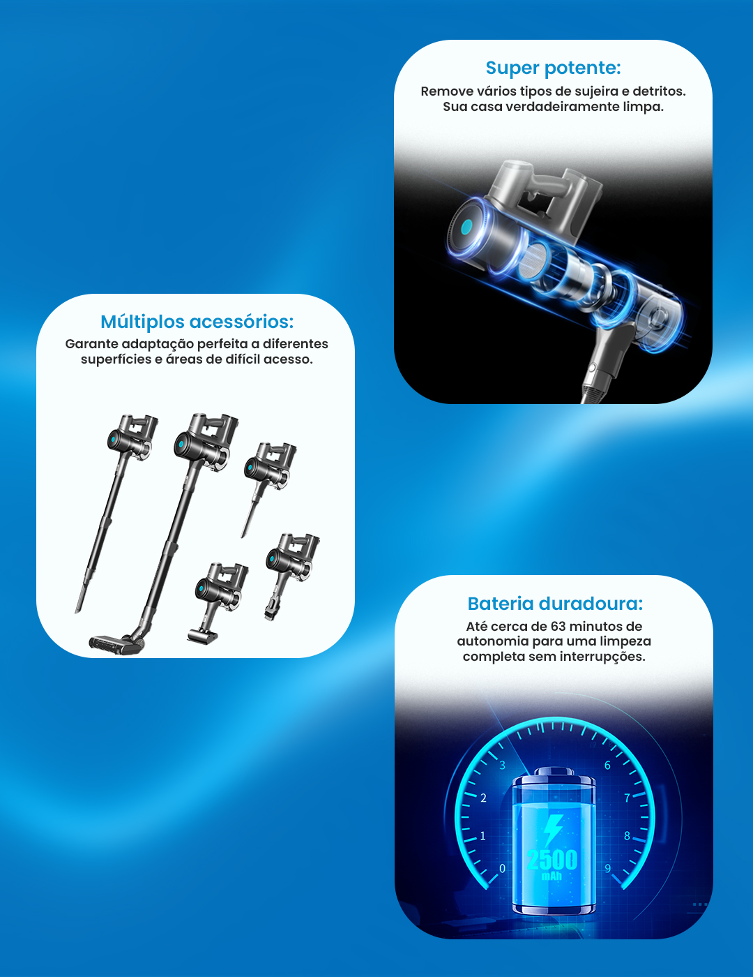 Altamente potente, sem fio e com bateria duradoura, ele garante total liberdade para limpar pisos, carpetes, sofás, camas, teclados, persianas e até cantos difíceis e frestas.