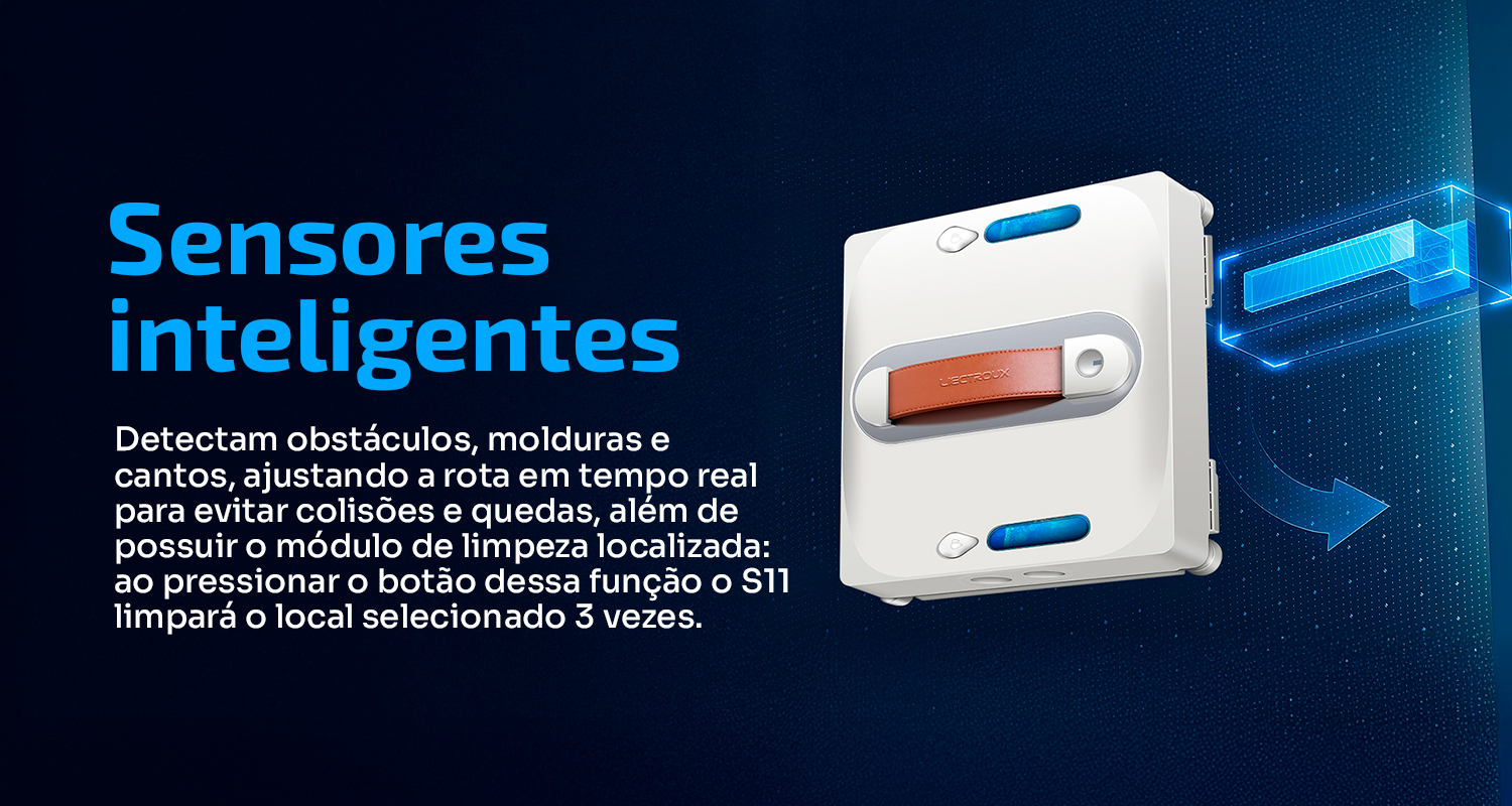 · SENSORES INTELIGENTES: Detectam obstáculos, molduras e cantos, ajustando a rota em tempo real para evitar colisões e quedas, além de possuir o módulo de limpeza localizada: ao pressionar o botão dessa função o S11 limpará o local selecionado 3 vezes.