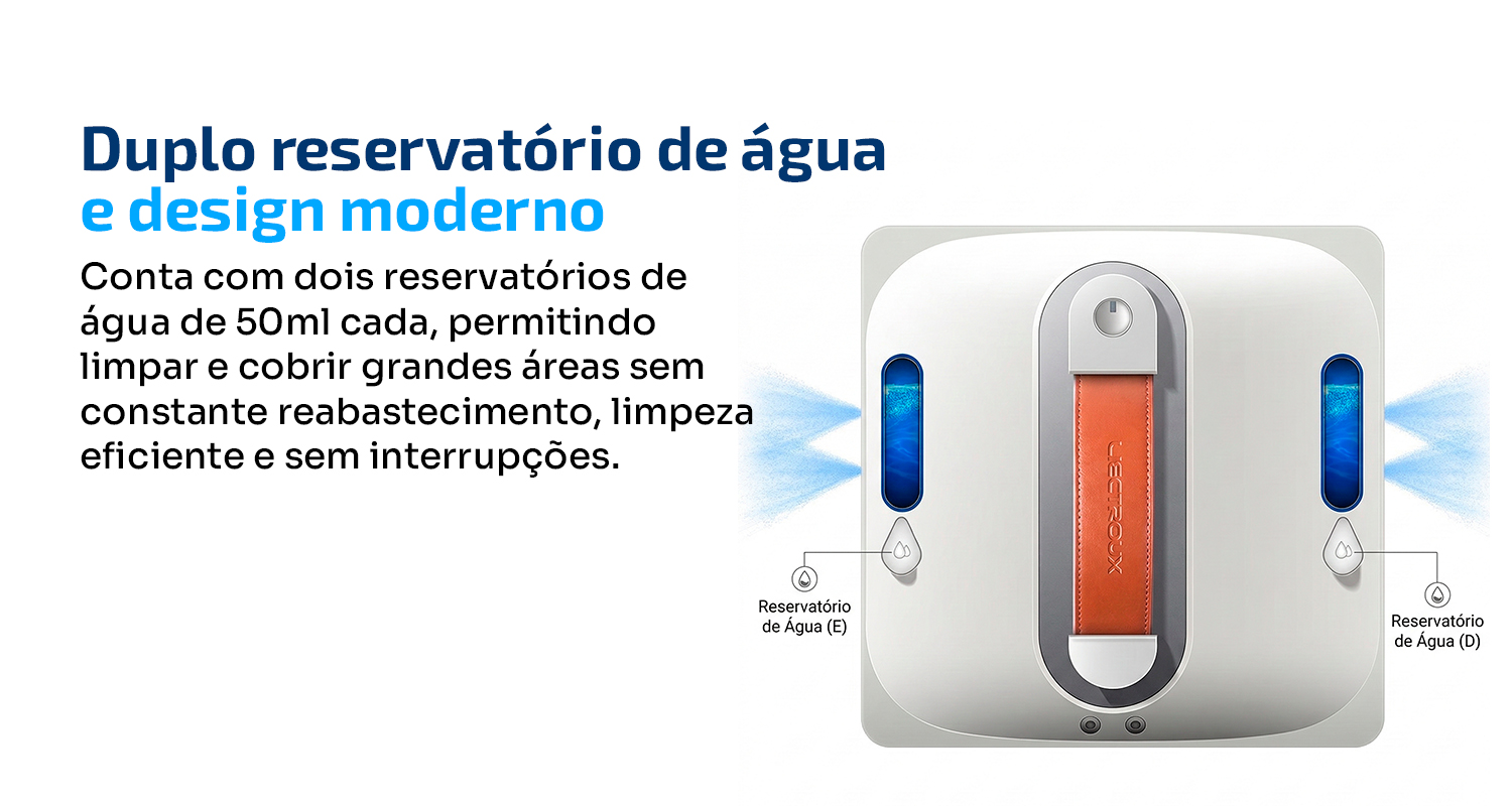 · DUPLO RESERVATÓRIO DE ÁGUA: Conta com dois reservatórios de água de 50ml cada, permitindo limpar e cobrir grandes áreas sem constante reabastecimento, além de proporcionar maior duração durante o processo de pulverização dos jatos de água para uma limpeza sem interrupções.