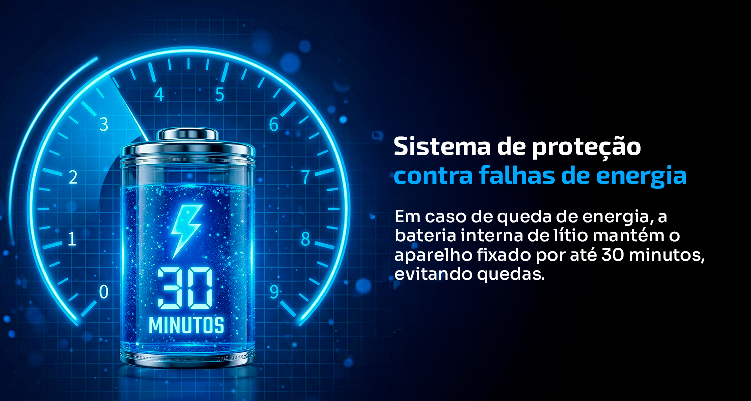 2 - SISTEMA UPS CONTRA FALTA DE ENERGIA: Em caso de queda de energia, a bateria interna de lítio mantém o aparelho fixado por até 30 minutos, evitando quedas.