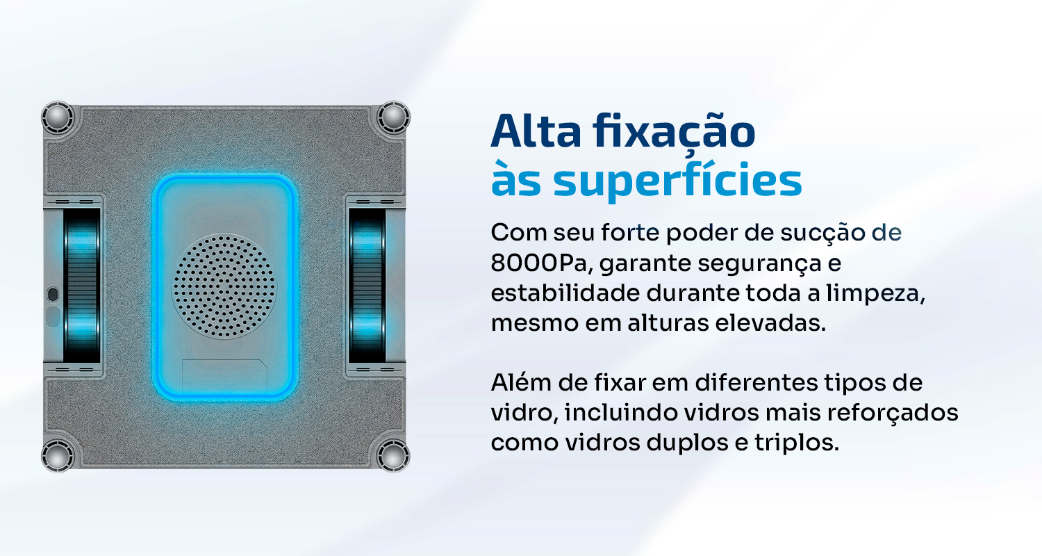 · ALTA FIXAÇÃO À SUPERFÍCIE: Com seu forte poder de sucção de 8000Pa, mantém o robô firmemente aderido enquanto desliza suavemente sobre o vidro, proporcionando limpeza segura mesmo em alturas elevadas.