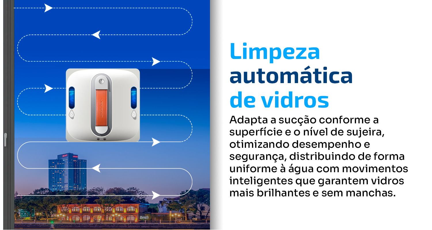 · VIDROS SEM MOLDURA: Equipado com sensores de alta precisão que detectam cantos e áreas abertas, permitindo o uso seguro mesmo em vidros sem moldura.