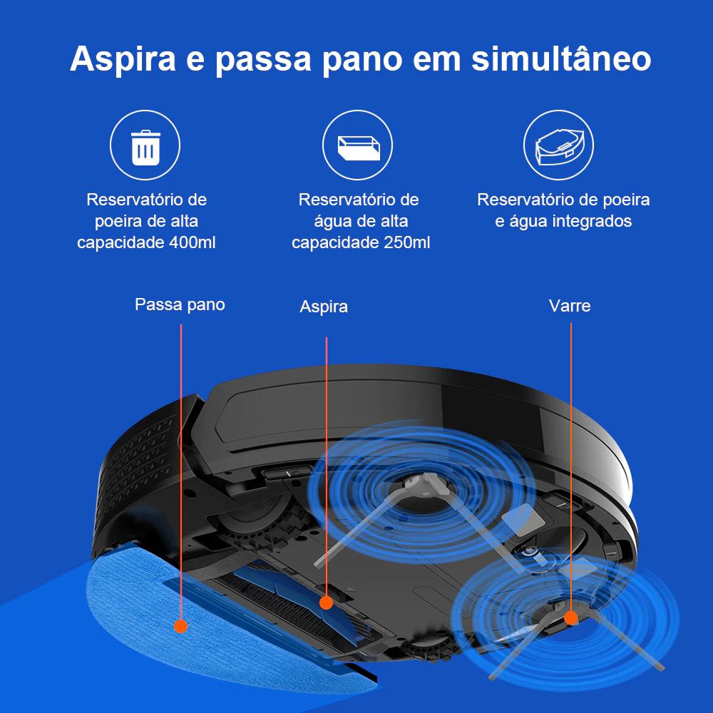 Com ele, você pode varrer, aspirar e passar pano automaticamente, deixando seu ambiente verdadeiramente limpo e renovado em instantes.