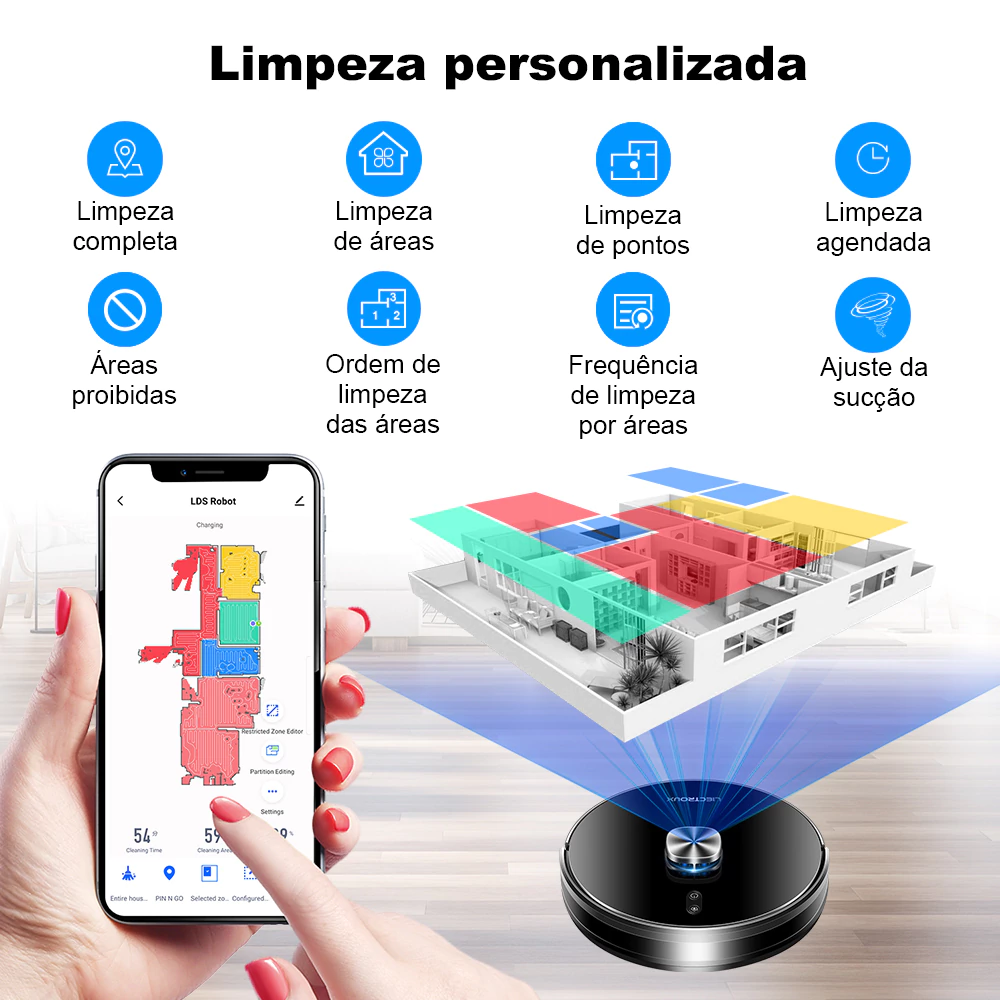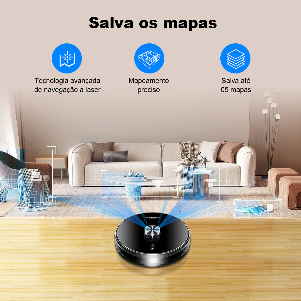 · LIMPEZA PERSONALIZADA DE ACORDO COM A SUA CASA: Graças à sua tecnologia de NAVEGAÇÃO A LASER, identifica e mapeia de forma inteligente todos os espaços da sua casa. Permite a definição de: áreas personalizadas; limpeza a partir de pontos de interrupção; paredes/barreiras virtuais; áreas proibidas; nomeação dos cômodos da casa e salva até 05 mapas!